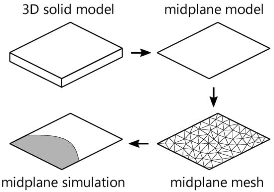 In a variety of applications, injection-molded parts have complex shapes and thin-walled structures. Consequently, researchers have carried out theoretical studies, focusing on filling thin cavities. These studies used the Hele–Shaw approximation and were carried out by Richardson [16], White [17], Kamal et al. [18,19], Broyer and Tadmor [20,21,22,23] as well as Hieber and Shen [24,25,26]. Within the framework of these models, the flow is assumed to be quasi-stationary and the inertial terms can be neglected due to the low Reynolds numbers associated with the flow of molten polymers [2]. The filling of a mold cavity is represented as a 2-dimensional (2D) flow problem in which the velocity in the midplane of the cavity is related to the pressure gradient by a quantity called fluidity S [1]. The fluidity represents the effects of changes in the temperature and the rheology of the gap. In order to represent the 3D geometry of the part, an arbitrary planar midplane with a specific thickness is used. This model is called a midplane model and is often considered as a 3D model in an industrial context. In academic studies, the model is usually referred to as 2.5-dimensional (2.5D) [2,5,27]. In terms of the filling process and mesh representation, midplane models can be considered as 2D models, as shown in Figure 2 [28]. Figure 2 shows a schematic procedure for midplane-based simulations, starting from the 3D solid model, through the generation of the midplane mesh, to the simulation result.