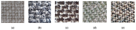 Five groups of coated samples, consisting of various woven fabrics used as substrates, were prepared for investigation. The details of the substrates used for coating are presented in Table 1. The images of substrates, taken with a phonoscope (Leuchtturm, Geesthacht, Germany) mounted on the phone, are presented in Figure 1. The magnification of the phonescope glass lens was 60×.