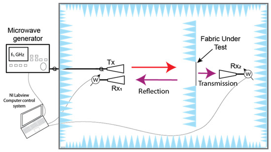 The examination of the reflective (Γ) and transmissive (T) characteristics of the newly designed textile fabrics was conducted across a frequency spectrum spanning from 2 to 18 GHz, encompassing the S, C, X, and Ku bands (2–4 GHz, 4–8 GHz, 8–12 GHz, and 12–18 GHz, respectively). These tests took place within a semi-anechoic chamber, and the illustration of the measurement setup can be found in Figure 2.
