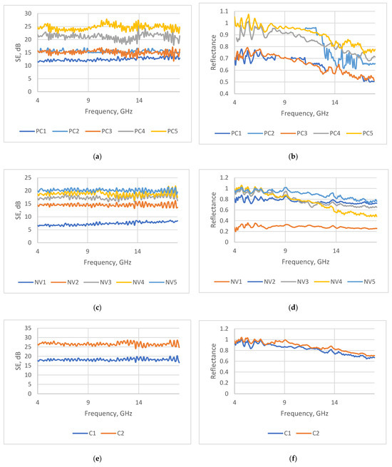 The results of the transmittance (T) are presented as the EMR shielding effectiveness (SE, dB), expressed in decibels: