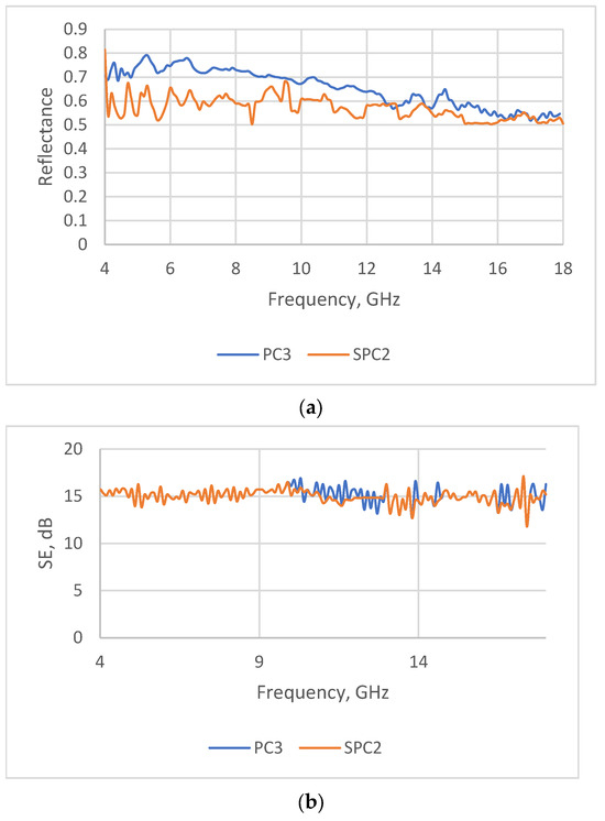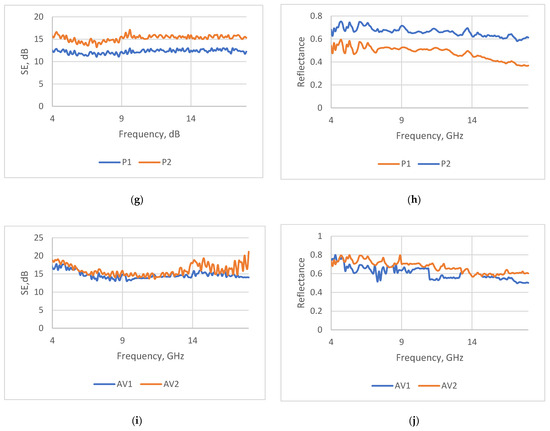 Islam et al. [43] developed a reduced graphene oxide/PEDOT:PSS-based knitted cotton fabric for EMI shielding applications. The modified cotton fabric exhibited outstanding electromagnetic interference shielding effectiveness, reaching up to 49 dB in the frequency range of 30–1530 MHz and 39 dB in the X band. However, in this case, the reflection dominated.