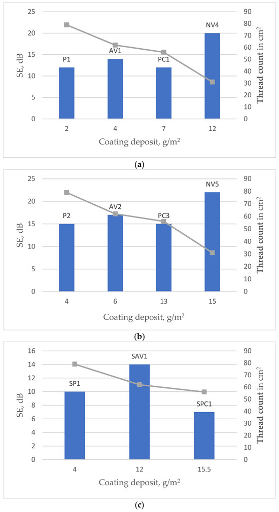 While investigating the influence of coating technology used, it was found that, in both cases (screen-printing or knife-over-roll coating), increasing the coating deposit, as well as the quantity of conductive additive, leads to a higher SE. However, to achieve a particular SE value using knife-over-roll coating technology, the required coating deposit amount is considerably lower as compared with the deposit necessary in the screen-printing case.