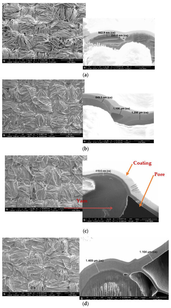 SEM images of PA/cotton fabrics coated with conductive paste: (a) sample SPC1, coated by screen printing, coating deposit of 14 g/m2; (b) sample SPC2, coated by screen printing, coating deposit of 23 g/m2; (c) sample PC1, coated by knife−over−roll coating, coating deposit of 7 g/m2; (d) sample PC3, coated by knife−over−roll coating, coating deposit of 14 g/m2 (magnification of all SEM images 5000× and 10,000×, respectively).