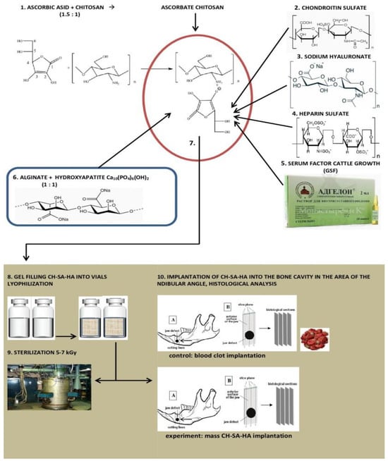 The successive stages of bone regeneration are often a long-term, chronic process. It is known that with a large area of bone damage, physiological repair is not able to eliminate the defect on its own, and the use of many replacement polymer structures does not provide the expected regeneration effect [1,2,3]. The creation of functional bone using highly biocompatible substrates capable of self-organizing molecular architecture makes it possible to close large bone defects [4,5]. The starting material can be chitosan with a high degree of purification and deacetylation with a glomerular conformation of the molecule in reaction with chondroitin sulfate, hyaluronate, heparin, and alginate [6].