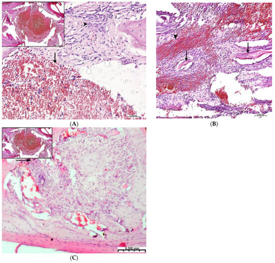 Regeneration of a bone defect in the lower jaw at the early stages of this experiment. (A)—experimental group; day 3 of this experiment, there is no bone tissue at the site of the defect; mesenchymal stromal cells (^) migrate to the area of the blood clot (↑) for further differentiation into osteoblasts; in the upper left corner of the control group, day 3 of this experiment, a formed defect with a blood clot (↑) is visible; the periodontal ligament (*) and the cortical plate of the lower jaw (^) are visible; (B)—CH–SA–HA group, day 7 of this experiment, islets of regenerating bone tissue (↑) in the area of hemorrhagic impregnation (^); (C)—control group, day 7 of this experiment, the bone defect is filled with immature connective tissue (↑).