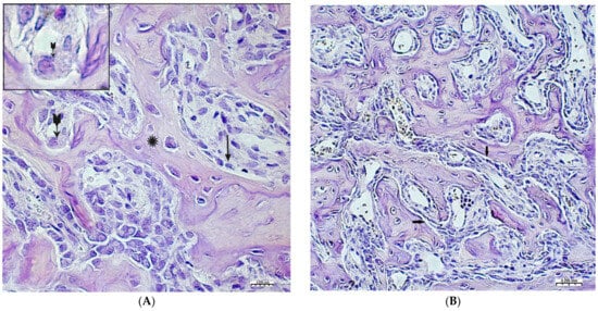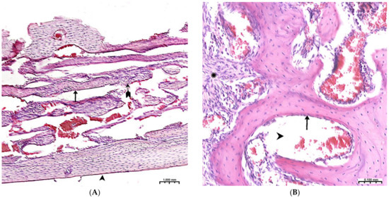 ). Hematoxylin–eosin staining; (B)—control group, 2nd week of the experiment; the osteoblastic surface of the bone beams is significantly smaller in comparison with the experimental group (↑). Hematoxylin–eosin staining.