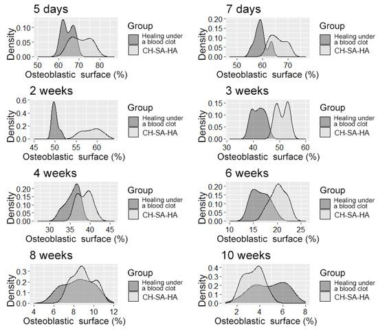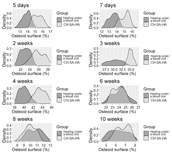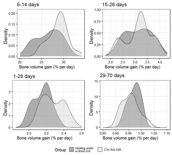 The density of the distribution of the variable, “increase in bone volume”, in the study groups at randomly selected intervals of the experiment.