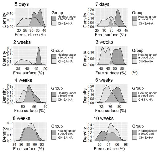 The distribution density of the variable is the “free surface” in the studied groups at different times of the experiment.