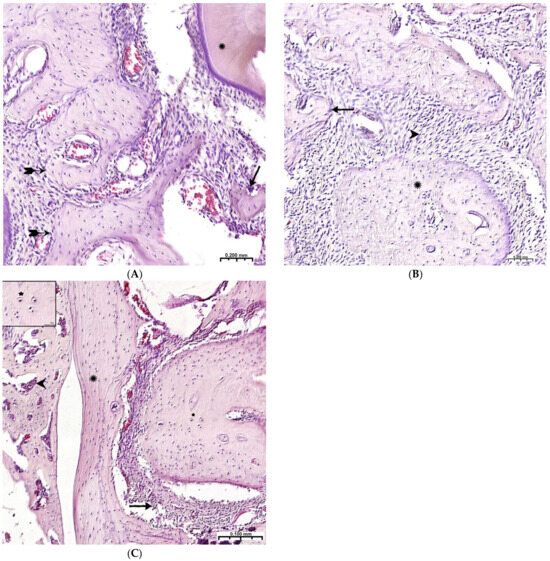 ), adjacent peripheral area with proliferation of maturing connective tissue, active vascular endothelialization of bone regeneration, single osteoclasts (↑), organization of compact bone and periodontal ligament (*); (B)—8 weeks, large amount of spongy (^) and compact (*) bone tissue with cellular reaction on the bone beams (↑) and the formation of many micro-vessels; (C)—experimental group, 10 weeks, the mandibular defect is closed by a compact bone, in the border zone there is mature connective tissue (↑), in the adjacent bone tissue (*)—reactive bone marrow structures (^), formed osteons (*), many Haversian canals with a vascular component; Hematoxylin–eosin staining.