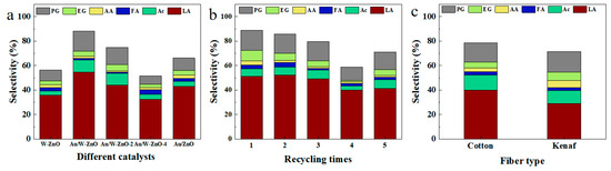 In addition, the catalyst requires a good conversion of real biomass as well. For example, Wang et al. used lead(II) ions to convert a sugar bagasse solution, obtaining a LA yield of 37% after 24 h [28]. Xia et al. fabricated the Fe-Sn-Beta catalyst and obtained a LA yield of 33.9% from microalgae [29]. To assess the catalytic performance of Au/W-ZnO for natural lignocellulosic feedstocks, cotton, and kenaf fiber were used since their natural yields are very large. (Figure 2c and Table S4). The raw materials were ground to sizes smaller than 60 meshes before the tests. It was found that cellulose could be converted entirely. Still, the LA selectivity obtained from the raw materials was slightly lower than that of cellulose conversion (40.1% for cotton fiber and 29.1% for kenaf fiber). This discrepancy might be due to lignin, hemicellulose, and other substances in the raw materials that could generate phenolic compounds, further inhibiting LA production [30]. The results showed that the catalyst has great application potential.