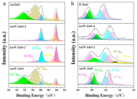 X-ray photoelectron spectroscopy (XPS) was employed to scrutinize the chemical states of these catalysts, as presented in Figure 4. These findings indicate that Zn species are present on the surfaces of Au/ZnO and Au/W-ZnO in the form of Zn2+. Conversely, only some surface Zn species were identified on Au/W-ZnO-2 and Au/W-ZnO-4. The Au 4f spectrum exhibited the existence of metallic Au0 and Auδ+ on Au/ZnO, with the latter being Au species located at Au-ZnO interfaces [33]. Similarly, metallic Au0 and Auδ+ were detected on Au/W-ZnO, but the ratio of Auδ+/Au0 was higher than that of Au/ZnO. This suggested the occurrence of electron transfer between Au species and W species. The W 4f spectrum of W-ZnO was analyzed, and it was found that there were W5+ and W6+ species present. The two peaks at 37.7 eV and 35.5 eV corresponded to W6+ 4f5/2 and W6+ 4f7/2, respectively, while the two peaks at 38.1 eV and 35.9 eV corresponded to W5+ 4f5/2 and W5+ 4f7/2 [34,35]. On the Au/W-ZnO catalyst, the W species also existed in W5+ and W6+. The ratio of W5+/W6+ on Au/W-ZnO was lower than W-ZnO, and the percentage of Auδ+/Au0 increased for Au/W-ZnO-2 and Au/W-ZnO-4. This indicated that electron transfers between Au and W species increased with the destruction of the ZnO structure [36,37].