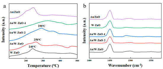 The strength of acid sites can be analyzed using NH3-TPD (Figure 5a). W-ZnO exhibited a broad desorption peak at 240 °C, corresponding to its weak acid sites. Two desorption peaks below 300 °C were observed on Au/ZnO, attributed to NH3 desorption from the ZnO and Au-ZnO interfaces. In addition to the expected NH3 desorption peaks on W-ZnO and Au/ZnO, a new desorption peak appeared at 350 °C on Au/W-ZnO, indicating the formation of moderately strong acid sites at the interface between Au and W species [16]. Moreover, after the destruction of the ZnO structure, the desorption peak at the high-temperature region remained. Its acidity increased, but the peaks at low temperatures almost disappeared. This suggests that acidity mainly originated from the presence of W and Au-W interfaces over Au/W-ZnO-2 and Au/W-ZnO-4, and the acidity caused by ZnO vanished due to the removal of ZnO.