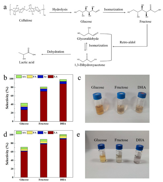 Based on the above results, a possible route of cellulose conversion into LA is proposed (Figure 6a). First, cellulose was hydrolyzed to glucose at the B acid sites in a hydrothermal environment, which was then isomerized to fructose at the L acid sites. Fructose was further converted into 1,3-dihydroxyacetone (DHA) and propionaldehyde (PLY) through reverse aldol condensation, and DHA was finally converted into LA through isomerization [38].