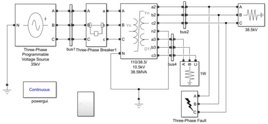 The Simulink reclosing process simulation model built based on SFSZ7-31500/110 transformer is shown in Figure 2. The rated voltage is 110/38.5/10.5 kV, and the parameters of load loss Pk, no-load loss P0, short-circuit voltage percentage Uk%, and no-load current percentage I0% are shown in Table 1.