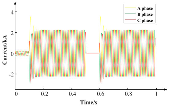 The time of reclosing is as follows: The transformer starts to operate normally, and the three-phase short-circuit fault occurs at 0.1 s, and it is a permanent short-circuit fault. The 0.5 s circuit breaker operates in tripping and cuts out the fault part. The 0.6 s circuit breaker operates in closing and the closing angle is 0°. The current waveform of the process is shown in Figure 3.