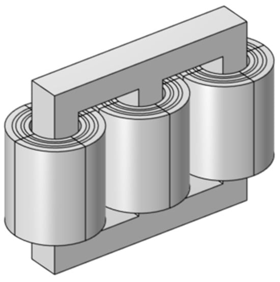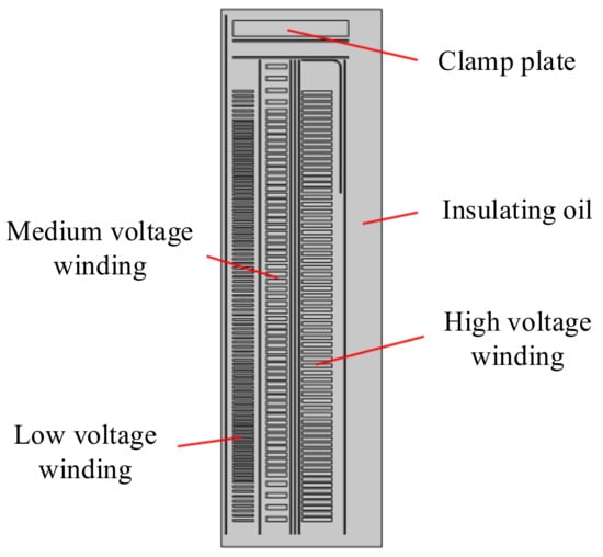 In order to calculate the short-circuit stress on the winding during reclosing, a three-dimensional magneto-circuit-force coupling finite element simulation model was established [16,17]. The following dimensions should be indicated in Figure 4. “Among them, the center distance between the columns is 1335 mm, the height of the core window is 1670 mm, the diameter of the core is 600 mm, the inner diameter of the low-pressure winding is 331 mm, the outer diameter of the low-pressure winding is 396 mm, the inner diameter of the medium-pressure winding is 435 mm, the outer diameter of the medium-pressure winding is 500 mm, the inner diameter of the high-pressure winding is 547 mm, and the outer diameter of the high-pressure winding is 640.5 mm.”