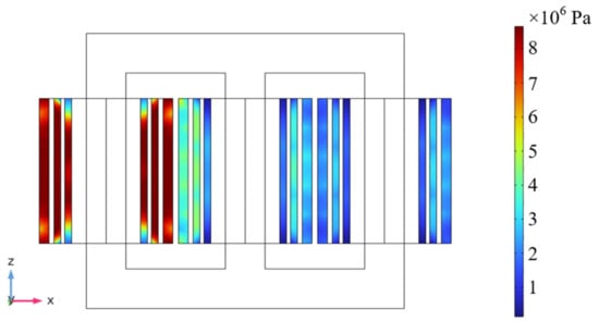 Figure 5 shows the distribution of short-circuit stress when the closing angle is 0°, and Table 2 shows the short-circuit stress at different closing angles. When the closing angle is 0°, the maximum short-circuit stress of the insulating paper is 8.71 MPa. This test will take this as the basis for adding mechanical stress.