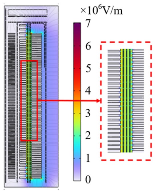 The established calculation model of the main insulation of the transformer winding is shown in Figure 6. The ground potential is set at the boundary of the model (a homogeneous boundary condition), 110 kV voltage is applied in the high-voltage winding, and the ground potential is also set in the middle-voltage and low-voltage winding. The calculated distribution results of the transformer main insulation composite electric field are shown in Figure 7.