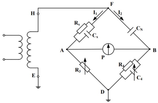 Dielectric loss factor is one of the basic indicators to characterize the insulation performance of objects. It is a characteristic parameter to characterize the specific loss of insulators under the action of alternating voltage, and has nothing to do with the shape and size of the insulators [27]. In this paper, a dielectric loss tester is used for measurement. The basic principle is the Schering bridge method. The diagram of the Schering bridge is shown in Figure 11.
