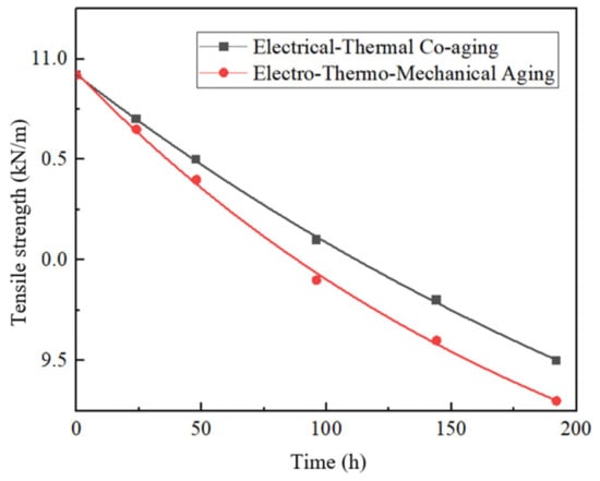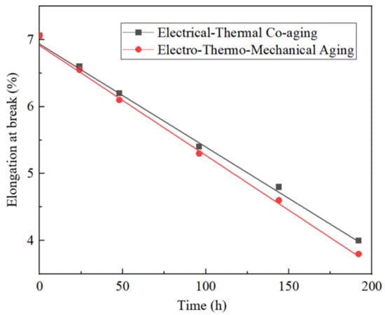 Combined with Figure 14 and Figure 15 and Table 7 and Table 8, it can be seen that the tensile strength and elongation at break of the insulating paper of the electro-thermal group and the electro-thermal–force group decrease with the increase in aging time, and the tensile strength of the insulating paper of the electro-thermal–force group decreases faster [30]. It may be due to the destruction of molecular bonds between cellulose under the action of the electric field and high temperature, which leads to the decrease in tensile strength and elongation at break. After the application of mechanical force, the decreased rate of tensile strength and elongation at break is accelerated, which may be due to the effect of force, which further aggravates the destruction of molecular bonds between cellulose.