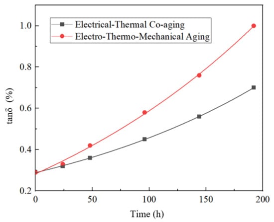 A dielectric loss tester was used to measure the dielectric loss factors of the electro-thermal combined aging group and the electro-thermal combined force aging group, respectively. The results are shown in Figure 16, and the relative change rate of the dielectric loss in the non-aging group is shown in Table 9.