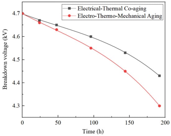Combined with Figure 17 and Table 10, it can be seen that the breakdown voltage of insulating paper decreases with the increase in aging time, and the decline is slower in the early stage of aging and faster and faster in the later stage. This may be because under the action of the electric field and high temperature, the defects inside the insulating paper are expanded, and the breakdown process of the oil–paper insulation is to find the “weakest link” of the oil–paper insulation system. The breakdown voltage of the electric–thermal–force group drops faster than that of the electric–thermal group. This may be due to the fact that under the action of mechanical forces, the internal defects of the insulating paper are further expanded, and breakdown is more likely to occur.