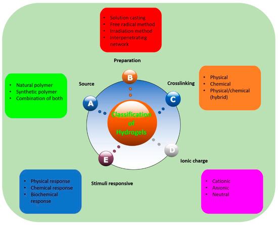 Figure 1 elucidates how polymeric hydrogels can be classified, according to different parameters, namely, the source of the hydrogel (i.e., natural or/and synthetic materials), the preparation method (i.e., through free radical polymerization reactions, gamma or UV irradiation, interpenetrating network formation, solution casting, or simple mixing), the type of crosslinking (i.e., chemical, physical, or hybrid), the possible ionic charge (anionic, cationic, or neutral systems), and even the type of stimuli responsiveness (i.e., biochemical-, chemical-, or physical-responsive hydrogels).