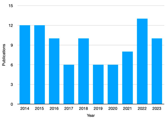 Number of publications (from 2014 to 2023), in peer-reviewed journals, dealing with “hydrogels AND frontal polymerization” (data collected from the Web of ScienceTM database, www.webofscience.com, accessed on 25 June 2023).
