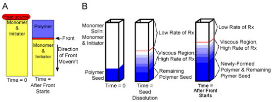 Given that the hot zone that is polymerizing is in contact with the monomer mixture that has not reacted yet, it can be guessed that enough heat exchange occurs at the interface to cause a local initiation of the reaction. The result is the growth of the hot polymerized phase at the expense of the cold monomeric phase. This growth is nothing more than a hot front of polymerization that ideally propagates until the whole monomer is converted into a polymer (Figure 3A).