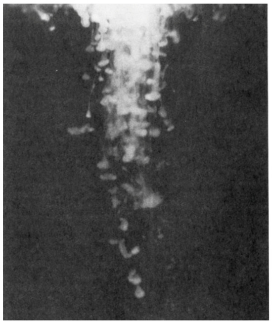 This is a phenomenon related to the previous aspects and is another possible reason for front quenching that can occur in the case of descending fronts. The hot polymer that begins forming at the expense of the underlying monomer is easily soluble in this monomer; alternatively, it could have a density such that it drips and infiltrates into the monomer [26]. If the refraction index of the monomer is sufficiently different from that of the polymer, such an infiltration visually manifests as “fingers” creeping into the underlying phase, hence the name fingering (Figure 6). Since this is a phenomenon that occurs in the same direction as the front, it leads to the front’s quenching, often associated with the initiation of polymerization in the areas of the monomer that have come into contact with the hot fingers, thus causing bulk polymerization.