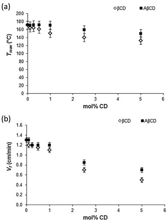 Front temperatures Tmax (a) and front velocities Vf (b) as a function of the molar amount of β-cyclodextrin (βCD, white symbols) and acryloyl-β-cyclodextrin (AβCD, black symbols). Reprinted with permission from [45]. Copyright Elsevier, 2016.