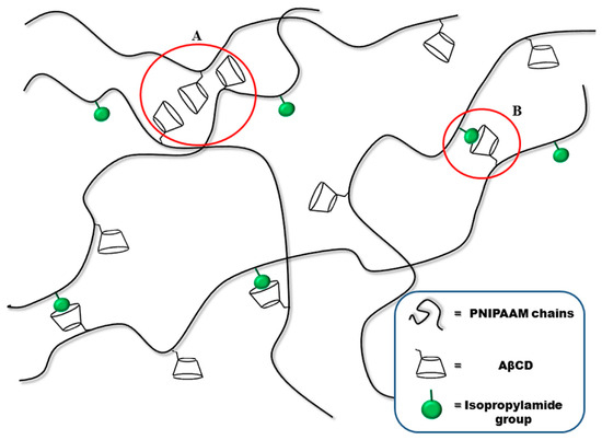 Supramolecular crosslinking in poly(N-isopropylacrylamide) hydrogels due to both mutual β-cyclodextrin interaction (A) and host–guest (i.e., inclusion complex) formation (B) with isopropylamide groups. Legend: PNIPAAM = poly(N-isopropylacrylamide); AβCD = acryloyl-β-cyclodextrin. Reprinted with permission from [46]. Copyright Elsevier, 2017.