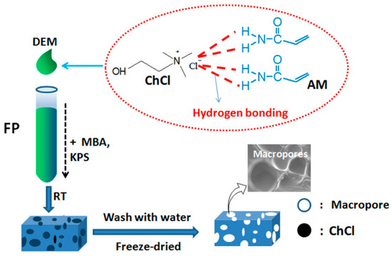 Another interesting approach that can be successfully exploited for preparing hydrogels for biomedical applications is the frontal polymerization of polymerizable deep eutectic monomers, i.e., a recently developed type of deep eutectic solvent that can be obtained by mixing quaternary ammonium and hydrogen bond donor monomers and is characterized by high thermal stability, low vapor pressure, low cost, high viscosity, and low toxicity [49,50]. In this context, Jiang and co-workers [51] synthesized macroporous polyacrylamide hydrogels via the frontal polymerization of deep eutectic monomers obtained by mixing several molar ratios of acrylamide and choline chloride, as schematized in Figure 9.