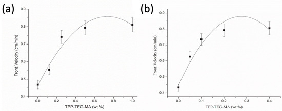 In a further research effort, Nuvoli and co-workers [45] exploited frontal polymerization for preparing two types of poly(2-hydroxyethylacrylate)-based hydrogels containing β-cyclodextrins that were either directly dispersed into the acrylic polymer or grafted (as acryloyl-β-cyclodextrin) onto poly(2-hydroxyethylacrylate) chains. The presence of 0.5 mol % of cyclodextrins, irrespective of their type, accounted for the maximum swelling ratio (about +300% with respect to neat poly(2-hydroxyethylacrylate)). Concerning the frontal polymerization reaction, both front temperatures (Tmax) and front velocities (Vf) were found to decrease when increasing the cyclodextrin loading (Figure 7). This finding was ascribed to the fact that the cyclodextrins behaved as an inert material, favoring heat dissipation. It is worth noticing that heat dissipation was reduced when acryloyl-β-cyclodextrins were utilized; the latter also promoted a significant increase in the glass transition temperature of the dry hydrogels compared to that of neat poly(2-hydroxyethylacrylate) (43 °C vs. 20 °C, respectively) because of an increased crosslinking effect induced by the functionalized β-cyclodextrins.