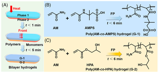 - Yang, Y.; Hu, J.; Liu, J.; Qin, Y.; Mao, J.; Liang, Y.; Wang, G.; Shen, H.; Wang, C.; Chen, S. Rapid Synthesis of Biocompatible Bilayer Hydrogels via Frontal Polymerization. J. Polym. Sci. 2022, 60, 2784–2793. [Google Scholar] [CrossRef]