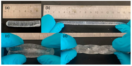 Rassu and co-workers [48] demonstrated the suitability of frontal polymerization for preparing hydrogels made of methyl cellulose and poly(acrylamide), using N-N′-methylene-bis-acrylamide as a crosslinker at different concentrations (ranging from 0.1 to 2.0 mol%). To this end, the reaction was carried out in water and glycerol: the latter led to higher front temperatures and front velocities with respect to the counterparts synthesized in H2O due to the evaporation of the solvent and subsequent heat loss. Further, with a constant methyl cellulose content, progressively increasing the crosslinker amount led to a noticeable decrease in the swelling ratio and a remarkable improvement in mechanical behavior irrespective of the employed solvent.