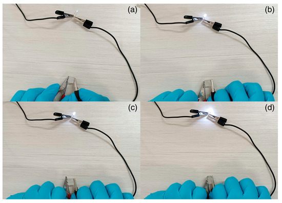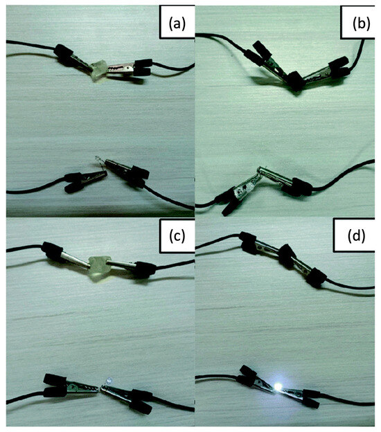 Brightness changes of LED connected to hydrogel circuit before and after absorbing water: (a) unfilled hydrogel before water absorption; (b) hydrogel containing 1.0 wt.% of N-doped carbon nanotubes before water absorption; (c) unfilled hydrogel after water absorption; (d) hydrogel containing 1.0 wt.% of N-doped carbon nanotubes after water absorption. Adapted from [73] under CC-BY 3.0 license.