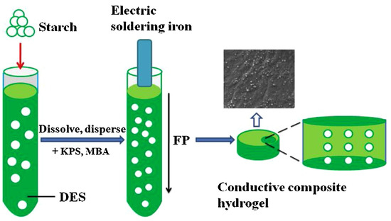 - Chen, Y.; Li, S.; Yan, S. Starch as a Reinforcement Agent for Poly(Ionic Liquid) Hydrogels from Deep Eutectic Solvent via Frontal Polymerization. Carbohydr. Polym. 2021, 263, 117996. [Google Scholar] [CrossRef]