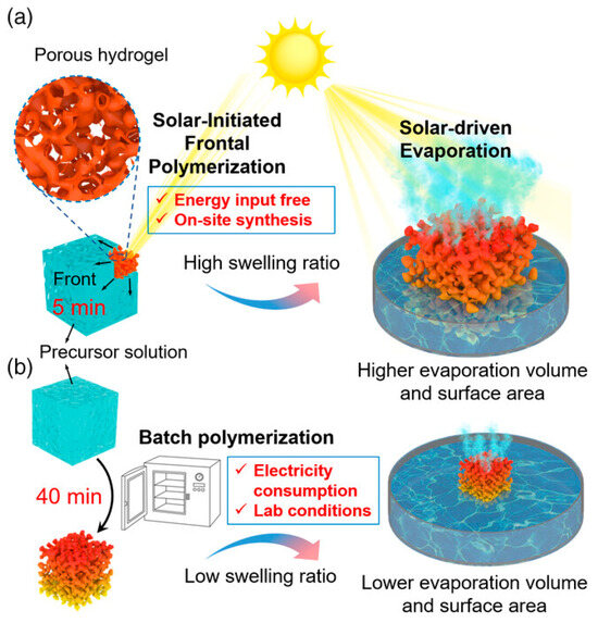 Schematic of solar-initiated frontal polymerization (a) and batch polymerization (b) for preparing hydrogel evaporator and evaporation processes. Reprinted with permission from [74]. Copyright Wiley, 2022.