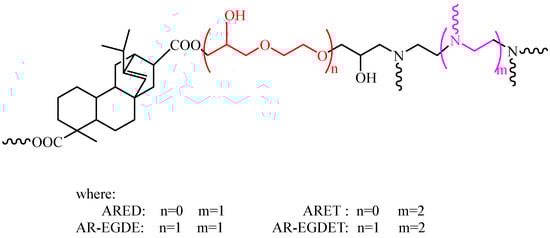 Wuzhou Sun Shine Forestry & Chemicals Co., Ltd. (Wuzhou, China) provided the acrylic acid rosin (ARA) (238 mg KOH·g−1). Ethylene glycol diglycidyl ether (EGDE) with an epoxy value of 0.73 mol/100 g was acquired from Wuhan Yuancheng Create Technology Co. (Wuhan, China) E-20 (DGEBA with an epoxy value of 0.20 mol/100 g) was purchased from Wuxi Resin Factory of Blue Star New Chemical Material Co., Ltd. (Wuxi, China). From Sinopharm Group Chemical Reagent Co., Ltd. (Shanghai, China), diethylenetriamine (DETA) and triethylenetetramine (TETA) were purchased. Epichlorohydrin (EC), ethanol (EtOH), acetone, potassium hydroxide (KOH), and triethylamine (Et3N) were of chemically pure quality and were utilized directly.