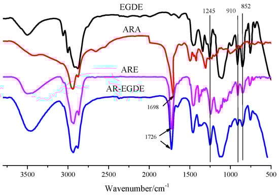 By reacting the carboxyl groups of ARA with EC or EGDE, respectively, it is possible to generate ester-containing ARE and AR-EGDE. Figure 1 and Figure 2 depict the formulations of the chemical reactions. The FTIR spectra of the EGDE, ARA, and epoxy monomers (AR-EGDE and ARE) are shown in Figure 4. For ARE and AR-EGDE, the broad absorption peaks attributed to the -COOH of ARA between 3000 and 3500 cm−1 and around 1698 cm−1 nearly disappeared. Simultaneously, the conspicuous absorption peaks at 1726 cm−1, ascribed to the elongation of carbonyl groups in the ester groups are clearly visible. This indicates that the ARE and AR-EGDE formed. The epoxy groups were also confirmed by absorption bands at 1245, 910, and 852 cm−1. The acid number of the reaction mixture decreased over the course of the reaction, reaching 0.5 mg KOH/g at the conclusion. This also demonstrated the esterification of the carboxyl and epoxy groups. In addition, the epoxy values for ARE and AR-EGDE were 0.35 mol·100 g−1 and 0.20 mol·100 g−1, respectively.