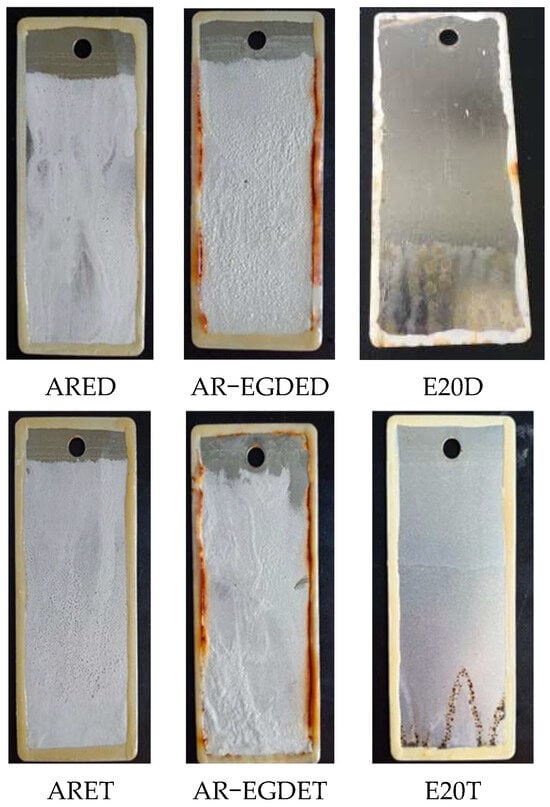 There was no whitening phenomenon observed in E20 epoxy coatings, but there was slight rusting. The water resistance of the E20 epoxy coatings was even worse than that of the AR-EGDE from a rust perspective. In most cases, a material’s low water resistance results from its high water absorption. Nevertheless, the water absorption rates of the E20 coatings were significantly lower than those of AR-EGDE coatings (Figure 6). This suggests that the fused ring structure of the AR-EGDE resins is more resistant to water than the benzene ring of bisphenol A types, which should be related to their superior adhesion.