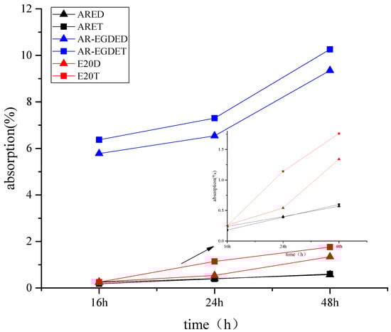 Figure 5 shows test images of tinplates immersed in water. The ARE epoxy coating without flexible chains turned white, whereas the AR-EGDE epoxy coating with flexible chains became wrinkly. This indicates that the water resistance of the rosin-based epoxy coating decreases as the flexible chain length of the epoxy monomers increases []. The reason for this is that as the flexible chain increases, the rigidity of the rosin-based fused ring decreases, and the cross-linking density of AR-EGDE resins decreases. Moreover, the flexible chain of the epoxy monomers contains hydroxyl groups and ether bonds that can form hydrogen bonds with water (see Figure 3). This conclusion was also supported by the water absorption tests of cured resins. In Table 3 and Figure 6, the AR-EGDE resins had 10 times higher water absorption rates than the ARE resins. When the epoxy monomers were identical and the curing agents were different, such as ARED and ARET, AR-EGDED and AR-EGDET, there was little variation in the water resistance of the resins. This demonstrates that the length of fatty amine curing agents has little effect on the water resistance of epoxy coatings.