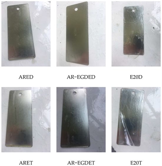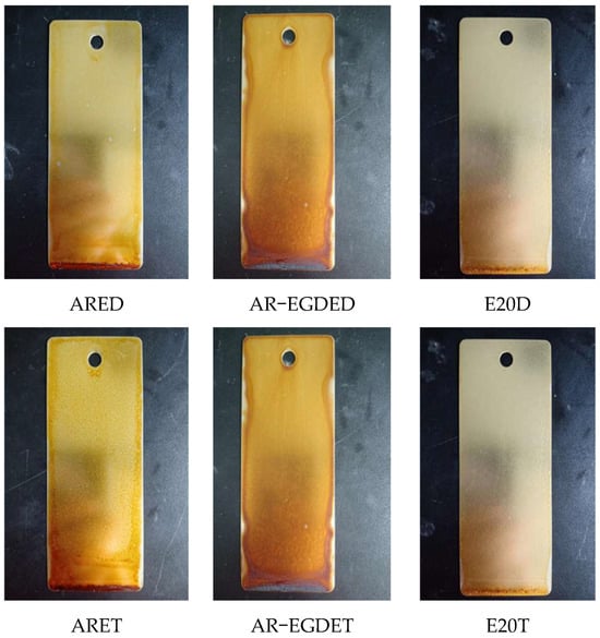 Figure 7 depicts photographs of each epoxy coating heated in an oven at 100 °C for three days. Based on Figure 7, the AR-EGDE coatings were the darkest brown, followed by the ARE coatings in golden yellow and the E20 in pale yellow when the same curing agent was used. The lower the heat resistance, the darker the color. Accordingly, the heat resistance decreases with increasing flexible chains and decreasing rosin-based fused rings, indicating that the fused ring structure has some heat resistance, but its heat resistance at 100 °C is inferior to that of bisphenol A epoxy resin. When the epoxy monomers are identical, there is no significant color difference between the ARED and ARET, E20D, and E20T coatings. This indicates that changes in the flexible chain of the curing agent have no effect on heat resistance. However, AR-EGDED has a slightly darker hue than AR-EGDEDT, indicating that the longer the flexible chain length, the greater the heat resistance of AR-EGDEDT.