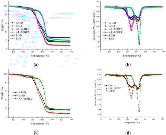 Thermal degradation curve of epoxy resins: (a) TG curves of epoxy resins; (b) D TG curves of cured resins; (c) TG curves of epoxy resins from DETA; (d) DTG curves of epoxy resins from DETA.