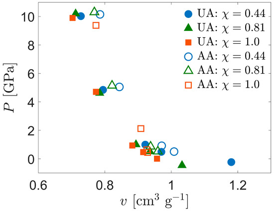 where v is the specific volume. From Figure 4, the compressibility along the Hugoniot curve () is only about 10% different between the UA and AA systems, clearly not enough to compensate for the temperature difference. We hypothesize that the ratio of constant-pressure to constant-volume heat capacities is closer to unity in the AA CPE than it is for the other systems, so the temperature increase in this system along the Hugoniot curve is correspondingly reduced. The basis for this hypothesis lies in consideration of a much simpler system—an ideal gas heated adiabatically. Although this simpler system is unsuitable for quantitative comparison with CPE in the current work, the temperature increase in CPE may be strongly dependent on the heat capacity ratio, by analogy to the ideal gas.