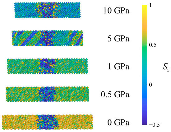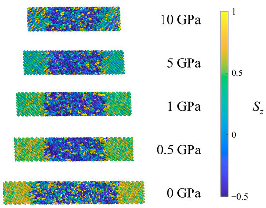 Example CPE system under ambient conditions (0 GPa) and after equilibration at several pressures in Hugoniostatted shock simulations. Atoms are colored according to the orientational parameter Sz.