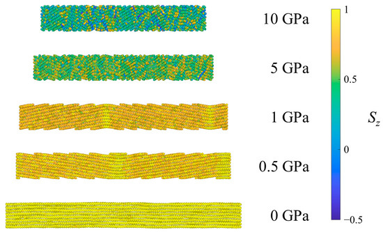 Figure 7 shows the UAs of one system of CPE colored according to the Sz for different pressures. An important observation is that the CPE system, due to constraints on the system geometry, is not free to tilt by large angles as the crystalline regions of SCPE systems are. In CPE, UAs on each side of the periodic boundaries perpendicular to the z-direction must be bonded, so tilting in one direction must be accompanied by tilting in the opposite direction elsewhere in the crystal and the formation of kink bands, such that the long period of deformation is commensurate with the simulation cell size. Such kink band formation is a typical case of buckling in response to compression. For low pressures, the systems have only two bends separating regions of tilt by different angles but similar Sz values. At 5 GPa, the long period or wavelength of buckling is reduced, resulting in the formation of multiple kink bands and higher tilt angles. Finally, at 10 GPa most of the nematic order in the crystal has diminished and the system loses long-range spatial correlations, forming numerous small regions of different alignment. Thus, for fully crystalline systems, kink bands are observed at all shock pressures, but the long period decreases with increasing pressure and eventually breaks up into disordered domains at the highest shock pressure, analogous to the large crystalline domain in SCPE81.