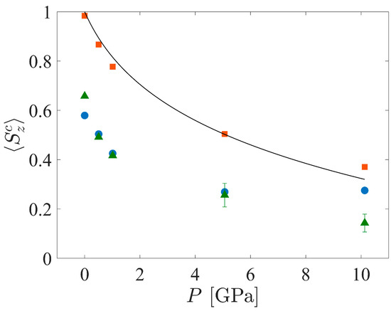 Mean orientational parameter, ⟨Szc⟩, vs. P for the crystalline populations of SCPE44 (blue circles), SCPE81 (green triangles), and CPE (orange squares). Also shown is a theoretical prediction of ⟨Szc⟩ vs. P for CPE based on the model of Pastine [62].