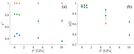 (a) χc and (b) ⟨p2c⟩ for SCPE44 (blue circles), SCPE81 (green triangles), and CPE (orange squares). Data are averages among the ten different starting configurations with error bars indicating three standard errors.